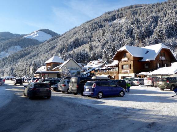 Het skigebied Riesneralm ligt in de vakantieregio Schladming-Dachstein in het district Liezen in Steiermark. De reis verloopt meestal via de A9 Pyhrn snelweg (oosten) of de A10 Tauern snelweg (westen) en vervolgens door het Ennstal over de B320 tot aan het kruispunt Trautenfels. Vanaf Trautenfels leidt de zeer goed uitgebouwde bergweg B75 (Glattjoch Straße) via de plaatsen Irdning en Donnersbach naar Donnersbachwald. Optimale sneeuwruiming vergemakkelijkt de reis voor auto's en bussen. De gratis parkeerplaatsen liggen direct bij het dalstation van de Riesnerbahn op een vlak terrein en in ruime mate, zodat de skidag zonder parkeerwachter stressvrij kan beginnen. Direct bij de Kinderskischaukel zijn er nog meer parkeerplaatsen.