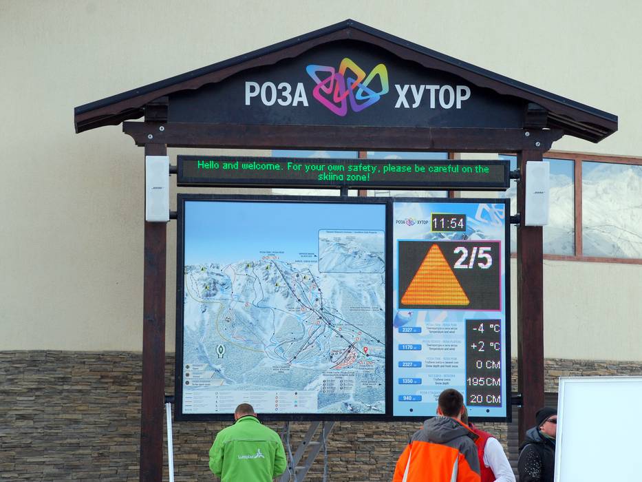 Grote informatiedisplays met elektronische aanduiding van geopende liften en pistes zijn te vinden op strategisch belangrijke punten van het skigebied. De bewegwijzering van de pistes kan nog verbeterd worden. Positief: Alle borden zijn in het Russisch (cyrillisch schrift) en in het Engels aangeduid.
