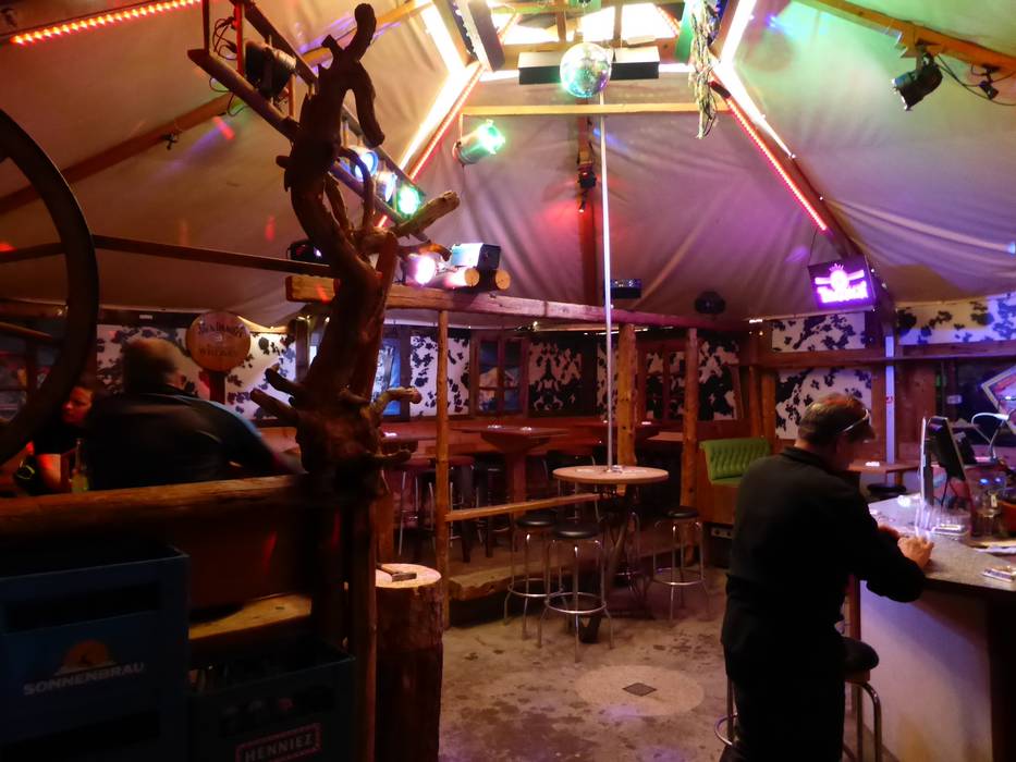 Iets verscholen in een feesttent achter de hut wordt hier dagelijks vanaf 14.00 uur après-ski aangeboden.