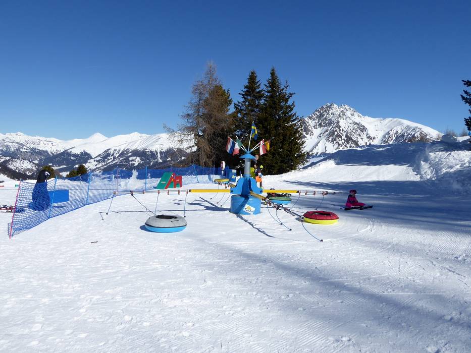 Direct aan het bergstation van de Schönebenbahn, op 2150 meter hoogte, ligt Schöni's Kinderland. Hier voelen de kleintjes zich helemaal thuis bij de transportbanden en de kindercarrousel. Schöni bezoekt het Kinderland ook regelmatig.
