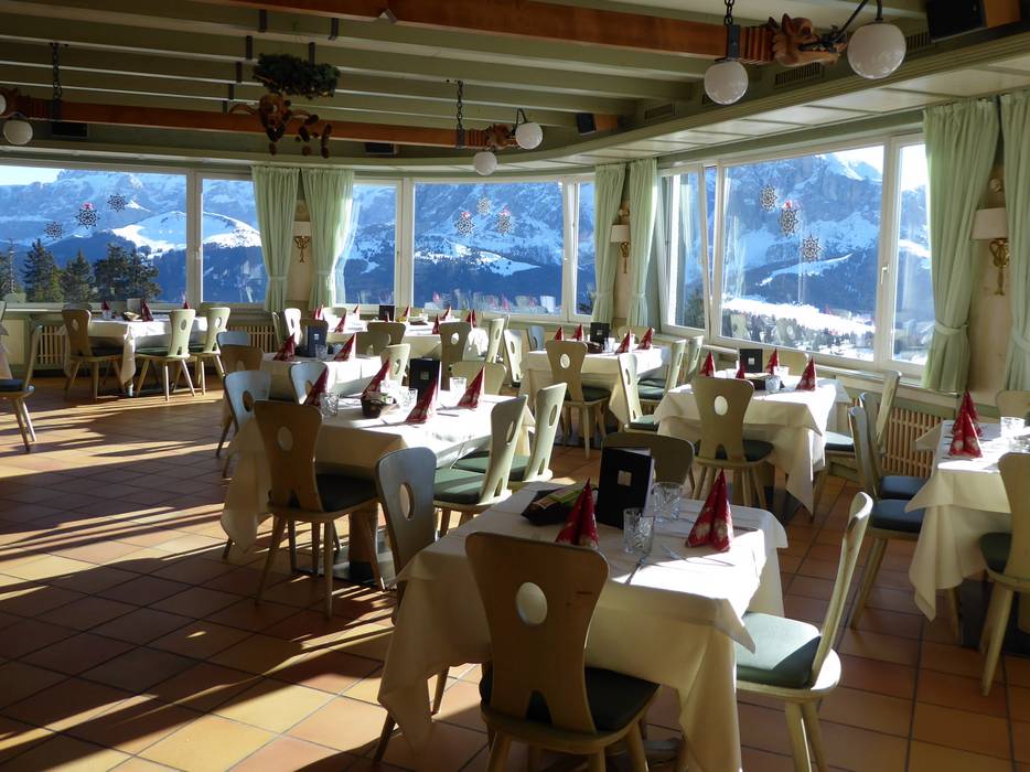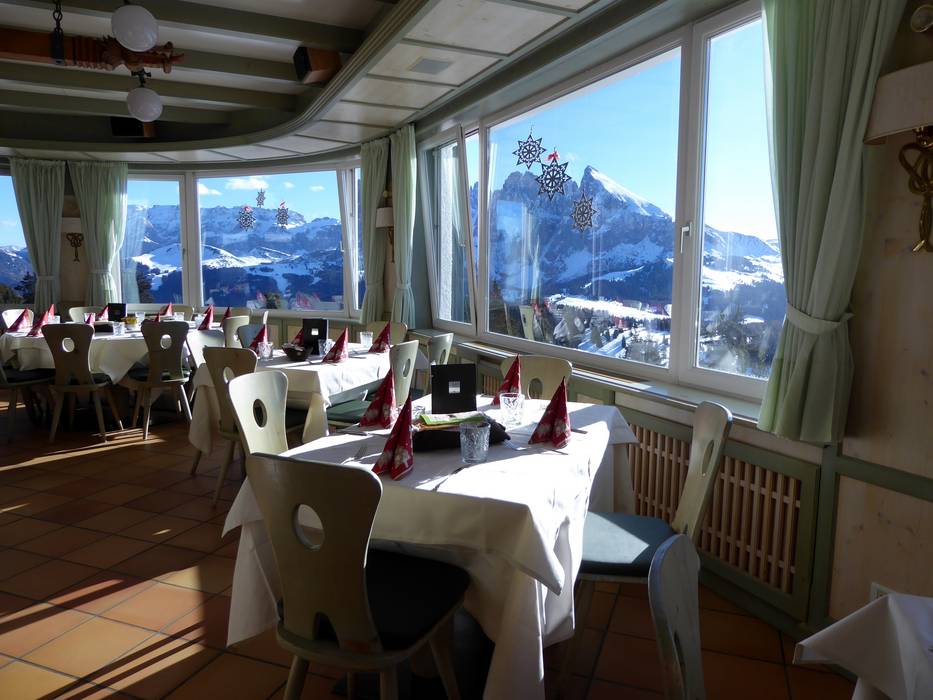 Vanaf restaurant Mont Sëuc heb je een adembenemend uitzicht op de toppen van de Seiser Alm, de Langkofel en de Schlern. Het restaurant serveert in de elegante eetzaal regionale topgerechten in een alpine sfeer.