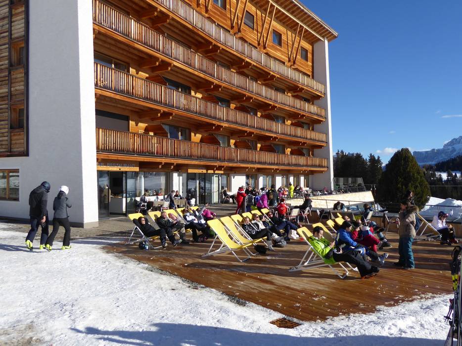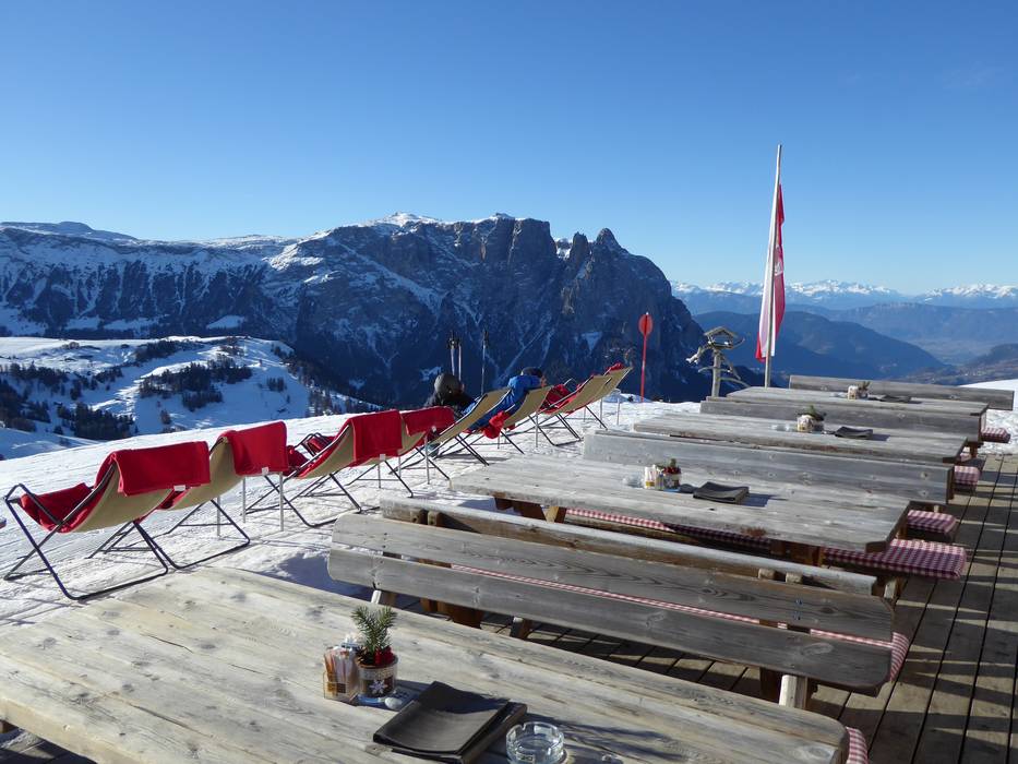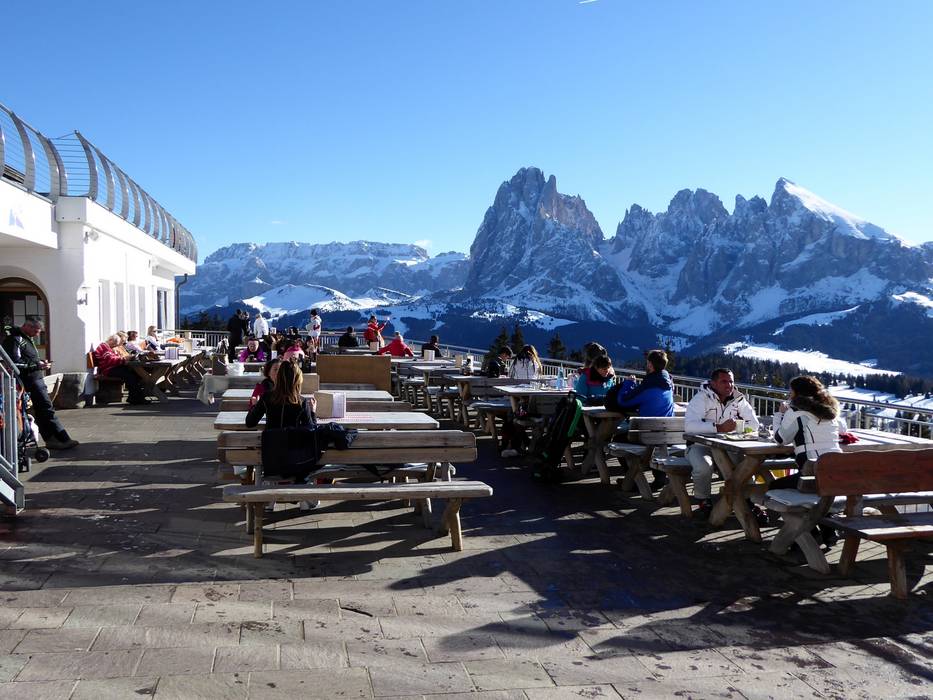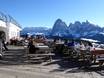 Op het zonnige panoramaterras heb je een prachtig uitzicht over de Seiser Alm. Er worden Zuid-Tiroolse specialiteiten geserveerd.
