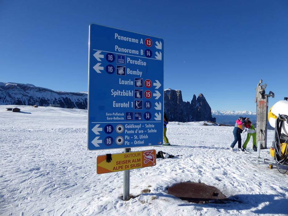 Oriëntatie (pistekaart, informatieborden, bewegwijzering piste) en veiligheid in het skigebied Seiser Alm (Alpe di Siusi)