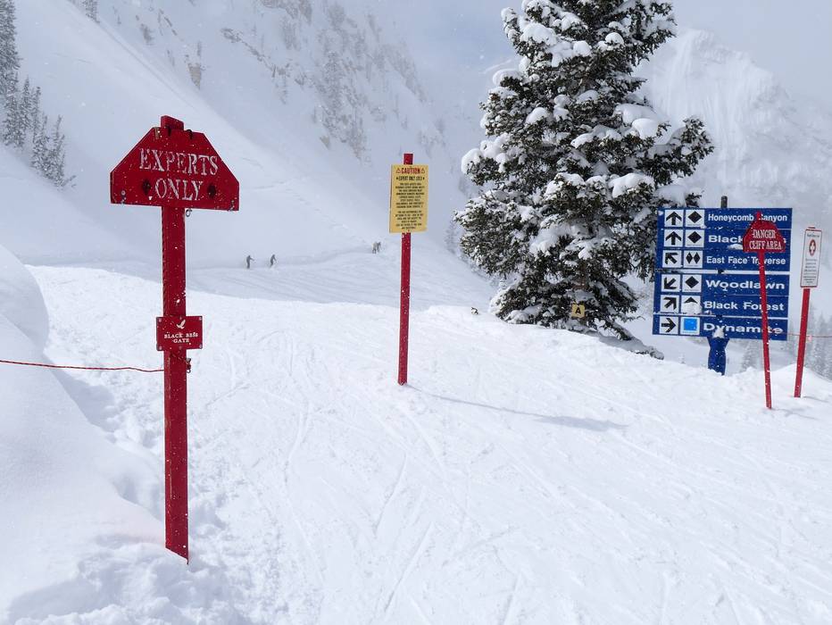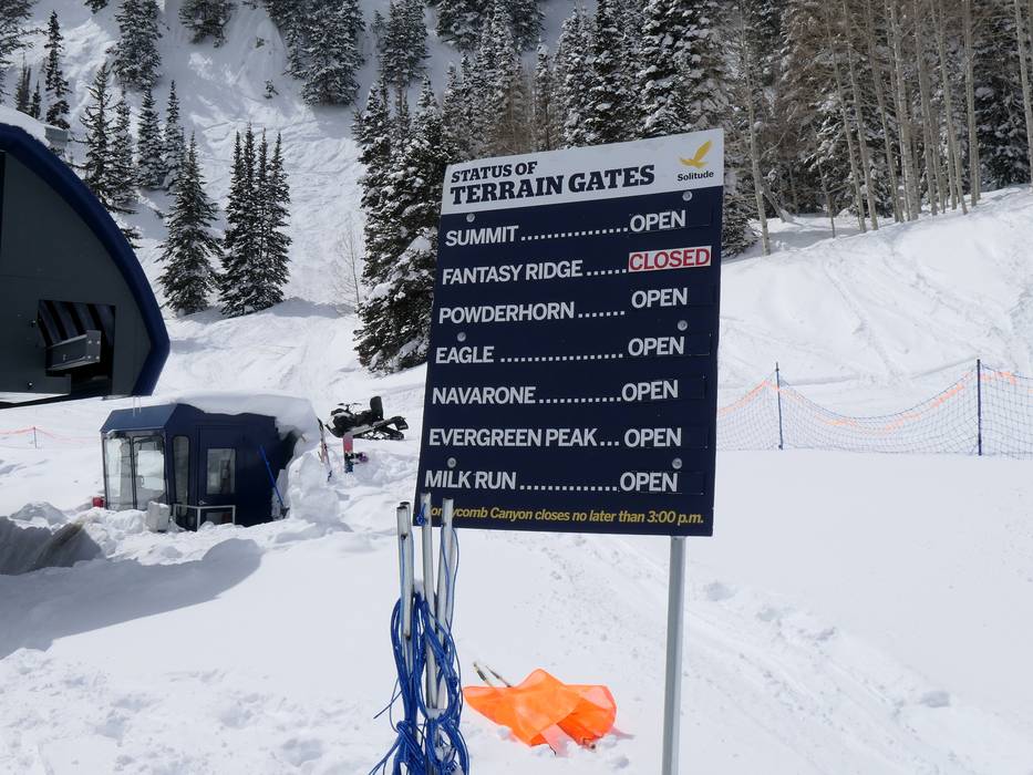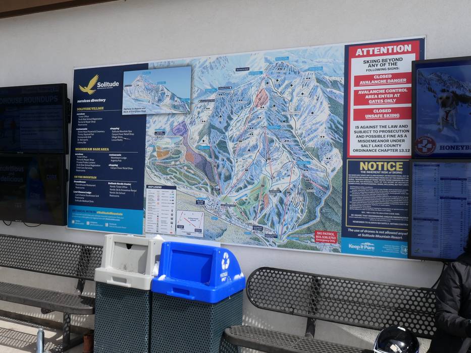 Informatieborden met pistekaarten zijn in het skigebied geplaatst. De actuele openingsstatus wordt op verschillende plekken weergegeven. De bewegwijzering in Solitude is duidelijk. De skigebiedsgrenzen en open of gesloten gebieden zijn goed te herkennen.