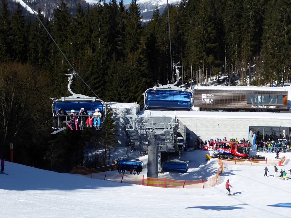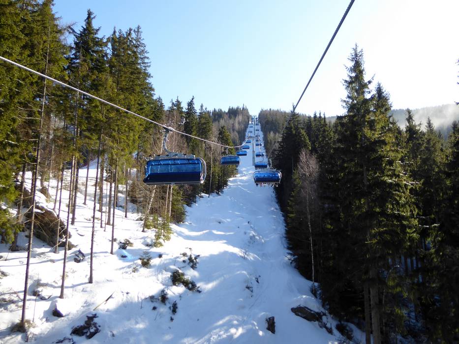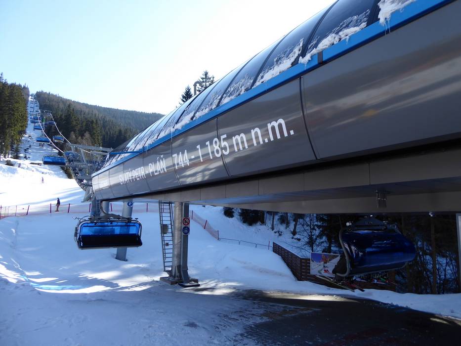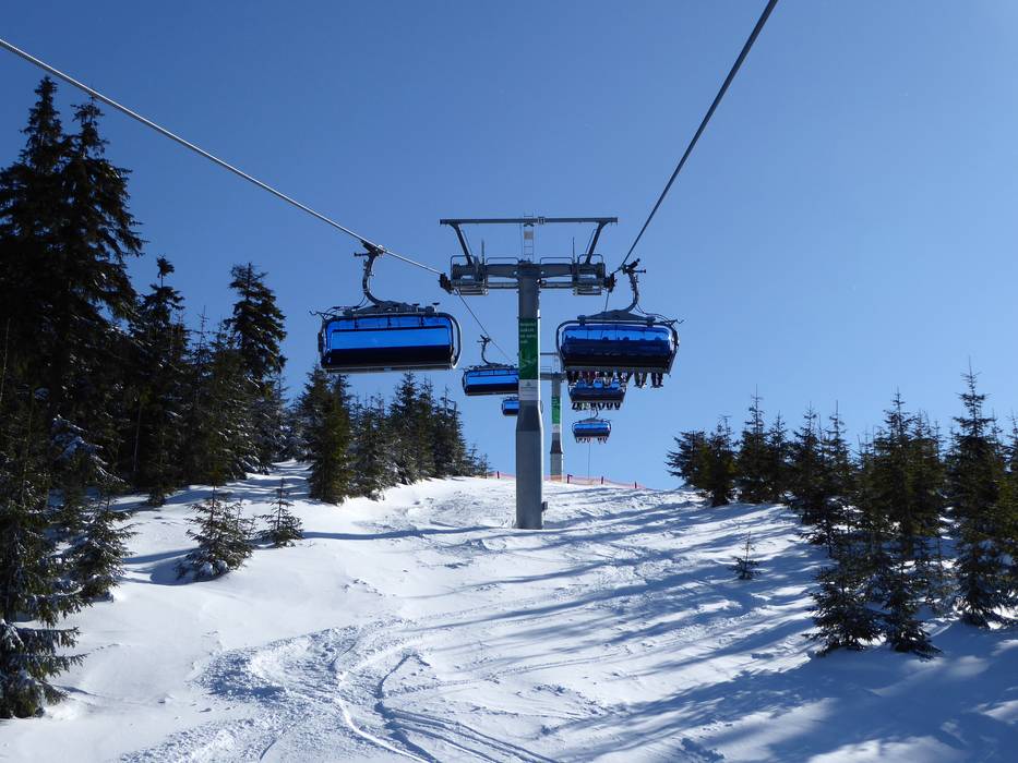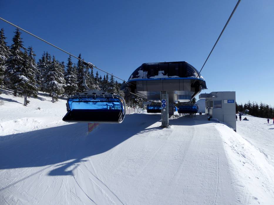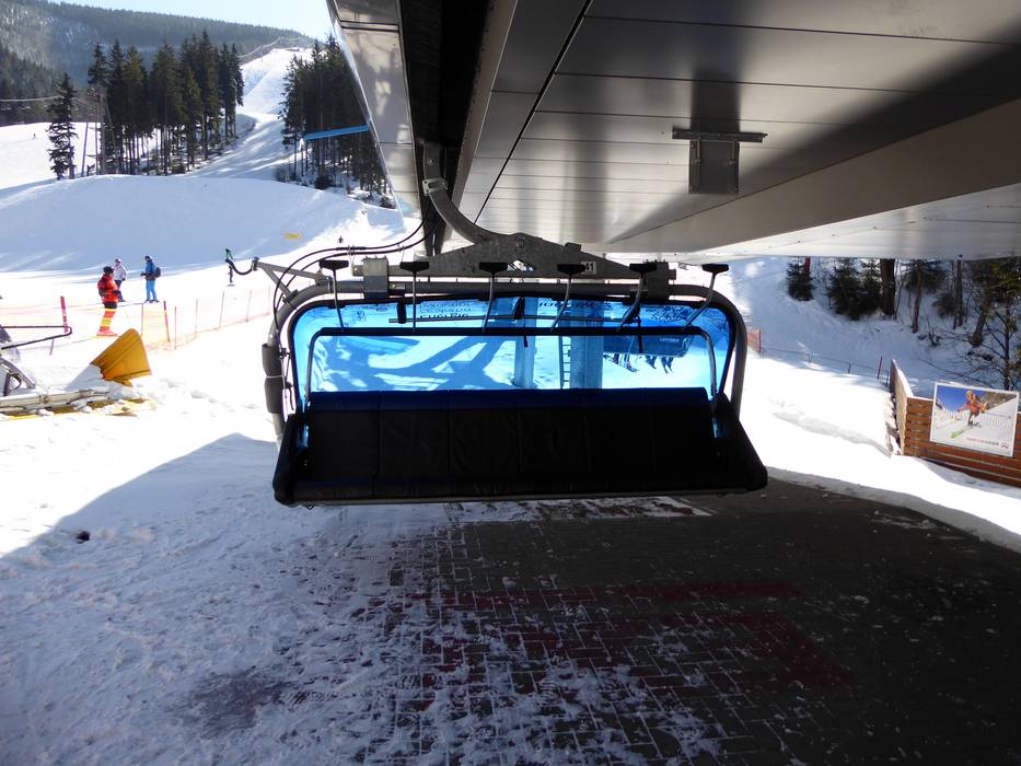 De 6-persoons stoeltjeslift Innogy Line Svatý Petr-Pláň is uitgerust met blauwe weerbeschermkappen.