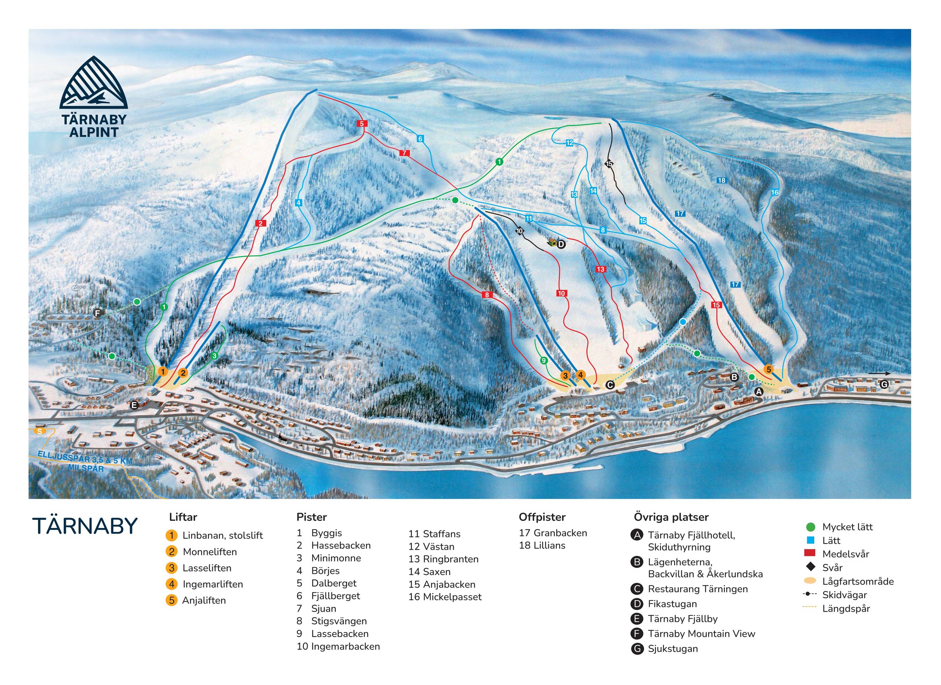 Het pisteplan geeft de skigebieden Tärnaby en Hemavan zeer goed weer. Alle pistes, liften en aanvullende informatie zijn opgenomen.
