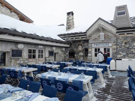 In het hele skigebied van Tignes/Val d'Isère zijn er skihutten en restaurants. In de plaatsen Tignes en Val d'Isère is er direct aan de pistes een ruime keuze aan eetgelegenheden. Liefhebbers van verfijnde gastronomie en gezellige skihutten vinden hier hun aanbod.