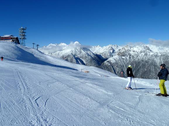 Panoramalift op de top met zonneschijn Belevingsplek Krahberg op de top van de Venet Start van de skidag op de Venet