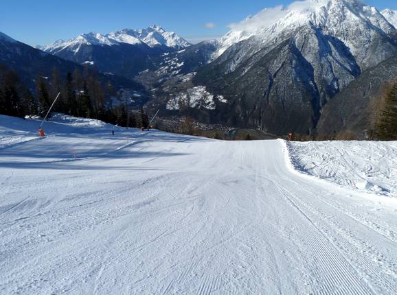 De dalafdaling leidt naar Rifenal. Er is geen piste naar het dalstation van de Venetbahn.