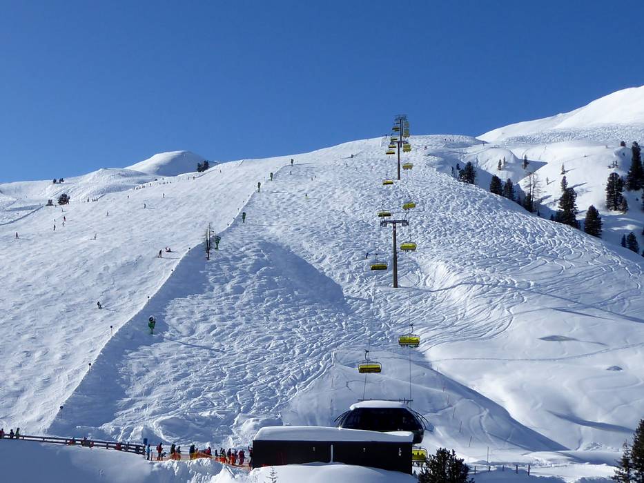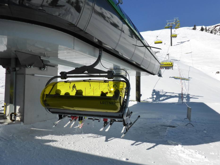 De 6-persoons stoeltjeslift Frühmesser X-press heeft gele weerkappen.
