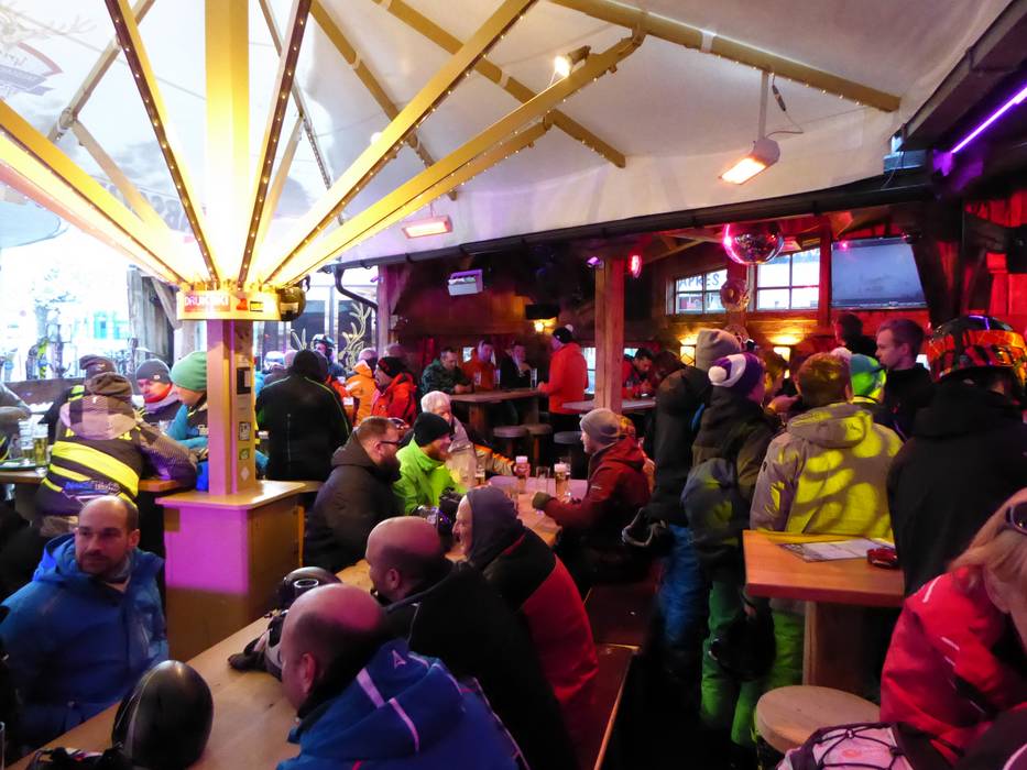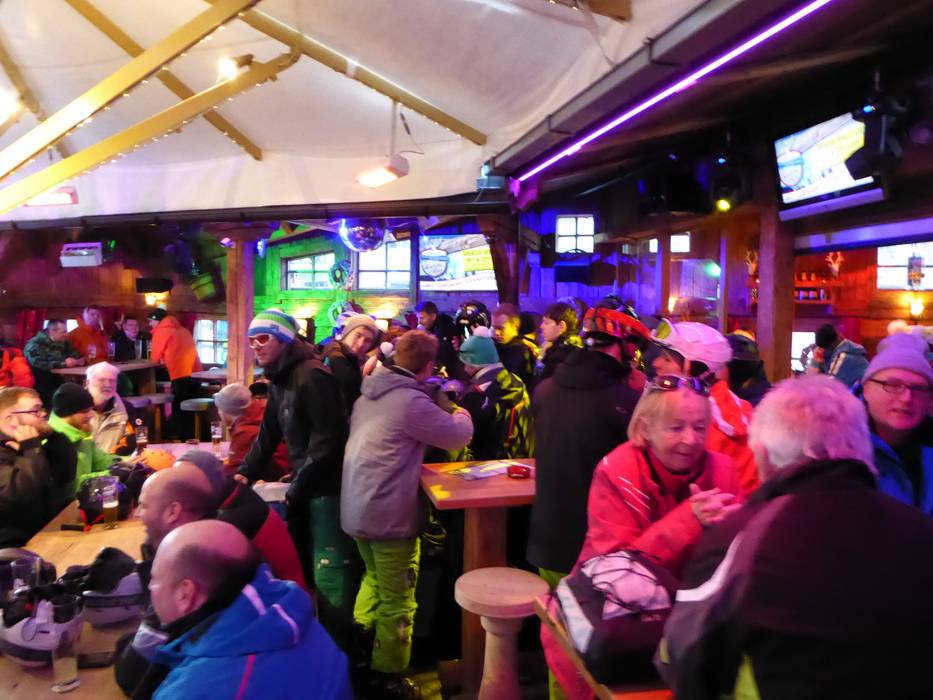 In de kleine, gezellige hut wordt er gefeest met après-ski-muziek.