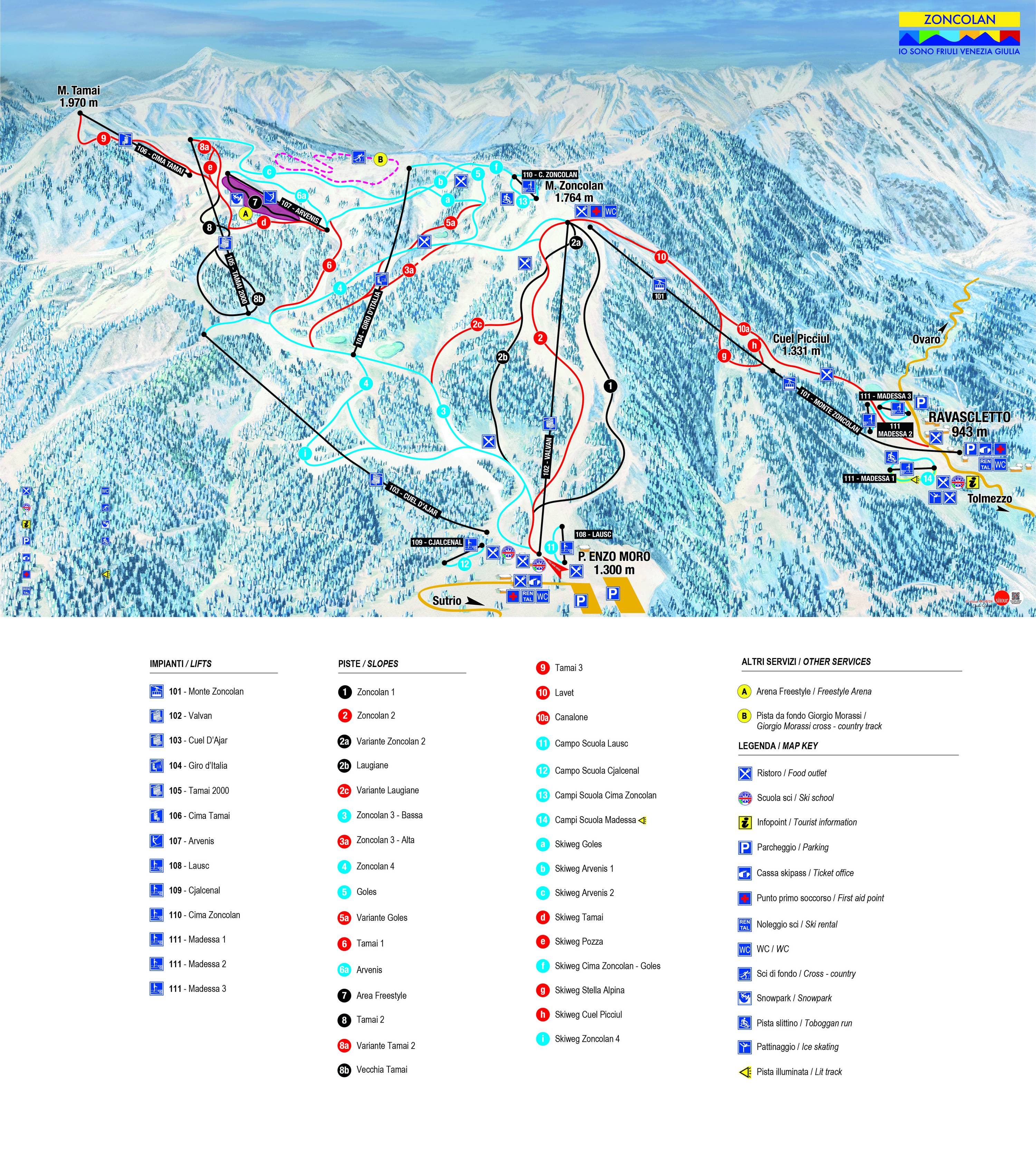 Ravascletto (0,8 km), Monte Zoncolan (0 km), Sutrio (9 km) Plaatsen bij het skigebied