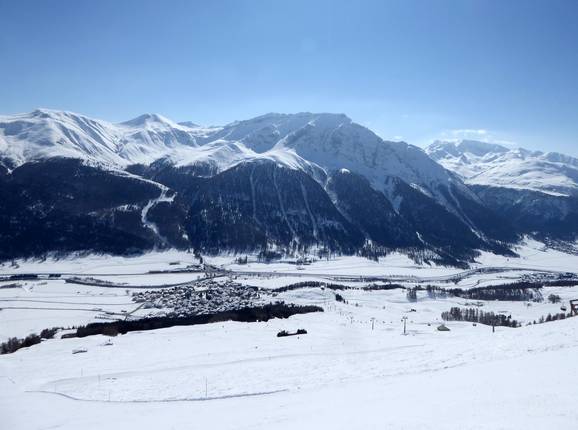 Uitzicht vanaf het skigebied over het prachtige… Begin van de skidag in het skigebied Zuoz Uitzicht vanaf de Castlatsch op de Pizzet