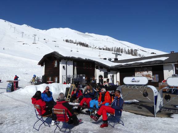 In het skigebied van Zuoz kun je de skidag gezellig afsluiten op de terrassen van de berghutten.